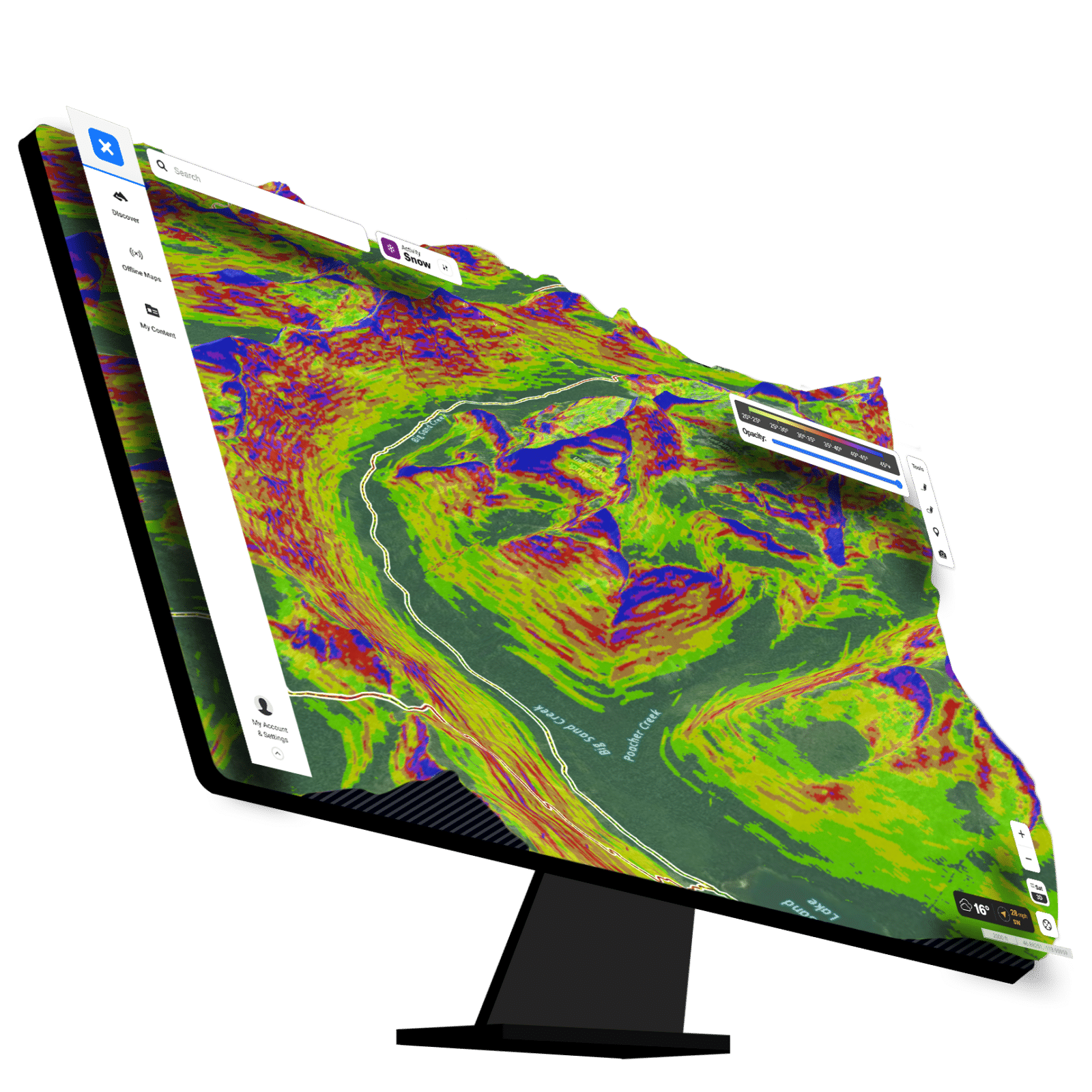 Slope Angle color grading that’s available on and offline for backwoods adventures or evaluating your hometown hill. Make smarter decisions in crux scenarios.